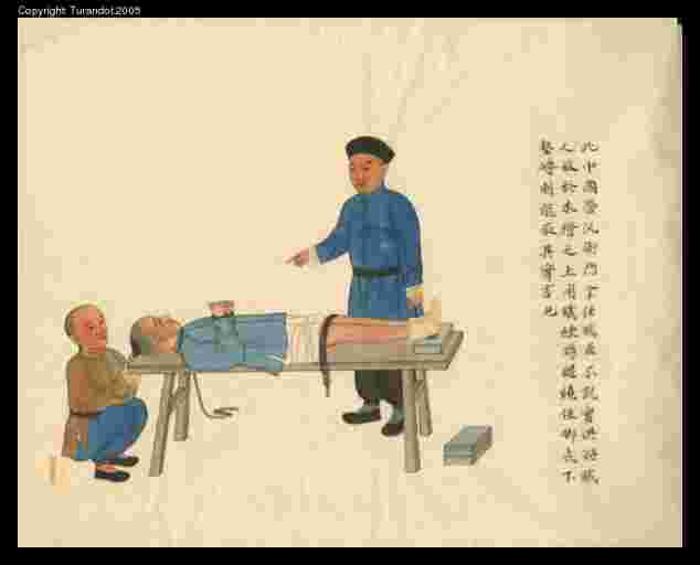 Caption: 此中國營汎衙門拿住賊匪不說實供將賊人放於木橙之上用鐵練將腿繞住腳底下墊磚則能取其實言也 In the Chinese busy (or perverse?) official services, when they catch a bandit who does not truly confess, they put him on a wooden bench (?? 橙means "orange") and use an iron chain to tie his legs, and a brick to under his feet, thus they can force him to confess the truth"