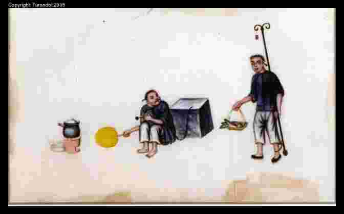 Description: Two chained prisoners preparing their meal.