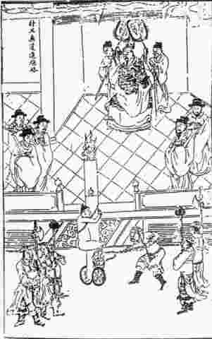 Description: Executioners burn their victim to death by tying his naked body to the heated paoluo pillar. Tyrant King Zhou and attendants look at the execution.