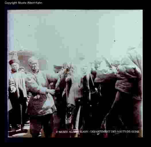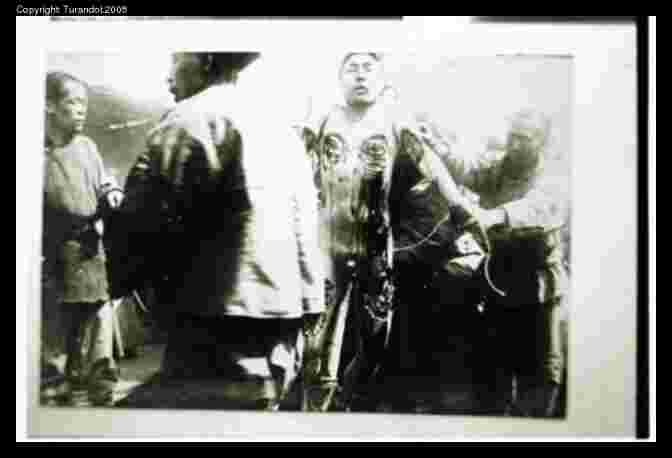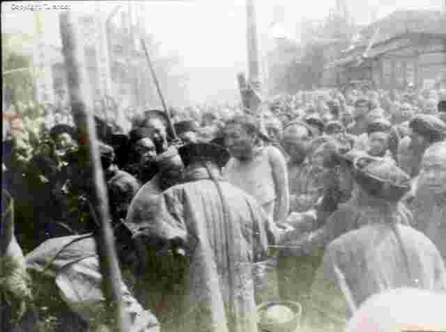 Lingchi C, Arrival2 The only broad angle shot in the set representing Lingchi C (Fu-zhu-li's execution), showing the huge crowd massed at close range of the executioners and the executed. The latter's expression is sorrowful. |