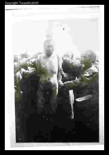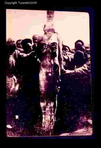 Lingchi C, 4th cut From a distance. Breasts and thights have been made, the arms are being untied to be scorched too. |