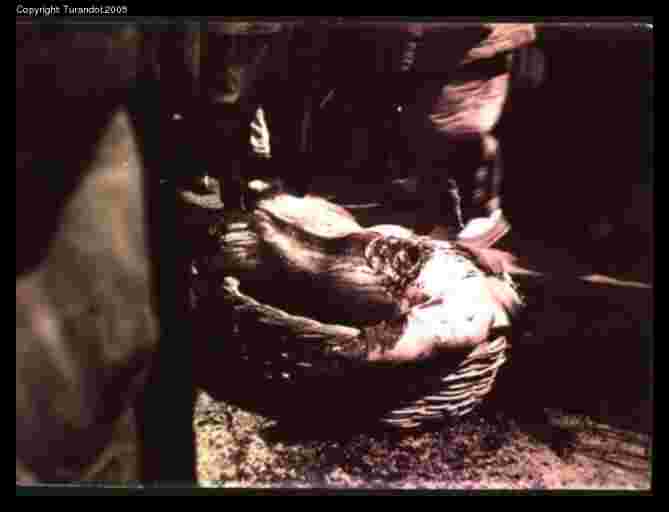 Lingchi C, view on remains basket in photocard The body parts, gathered in a basket, are exposed for a crowd to view. |