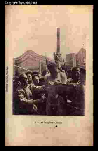 Lingchi C, untying the body Arms, legs, and finally the head having been cut, an attendant proceeds to untie the upper string holding the body to the galley, thus grotesquely substituting his own head to the elapsed one. |