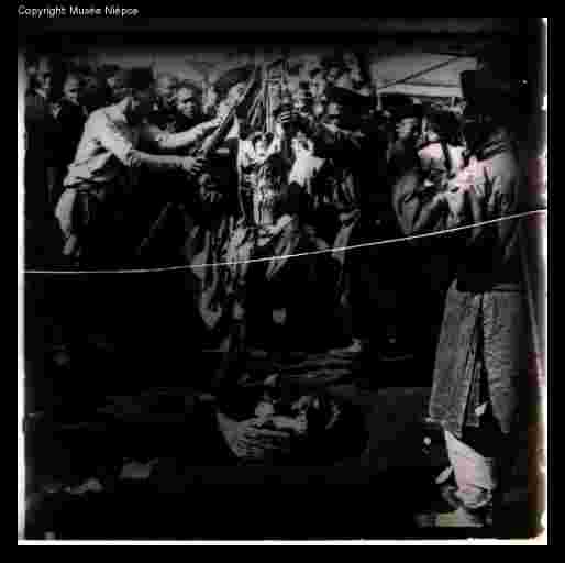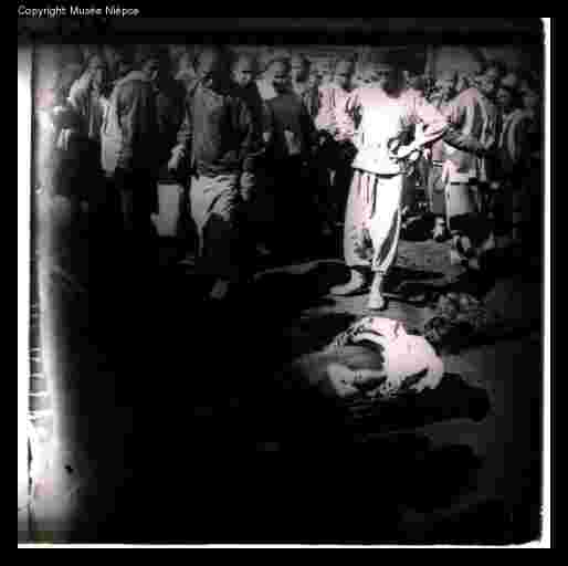 Lingchi A, 2nd cut (breasts) Assistant executioner (with mustach) presents the convict's face to photographer, under supervision of the chief-executioner (back at the foreground). |
