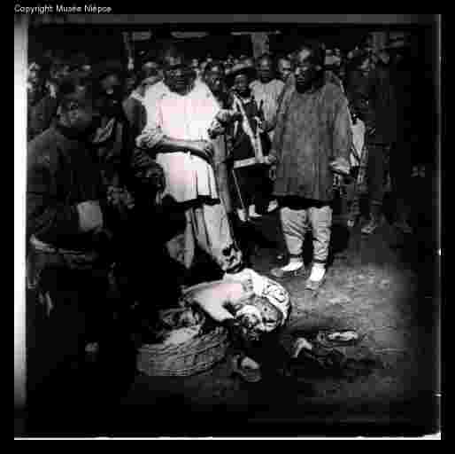 Lingchi A, the basket Chief executioner throws remains in a basket at the foreground. |