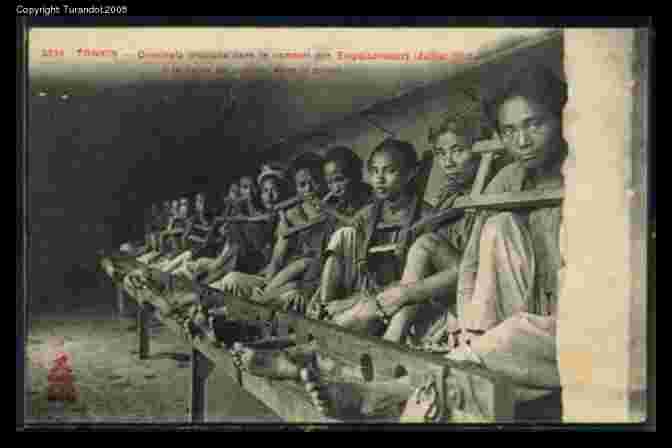 Caption: 3034 .TONKIN - Criminels inculpés dans le complot des empoisonneurs (Juillet 1908) à la barre de justice dans la prison