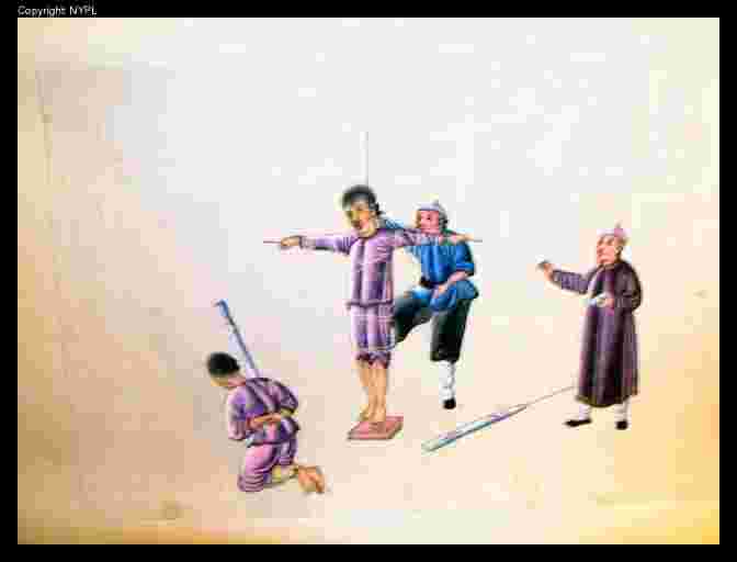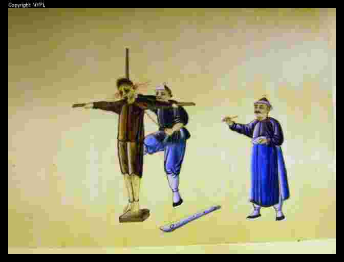 Information: This common way of representing the punishment of strangulation (jiao 絞) is likely to proceed from iconographic models than from real practice. More realistic views show, and some photographs, show that the various poles used with the garrote were not shaped like the Christian cross. The same model might have inspired these images, and the crucifixion-like decapitations or lingchi.
