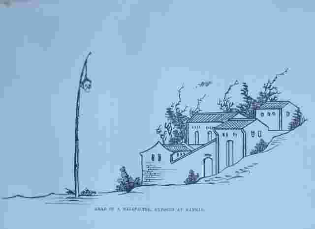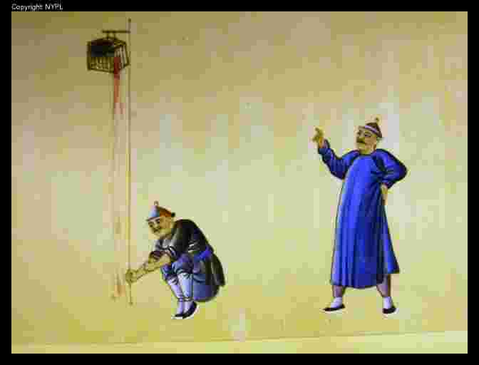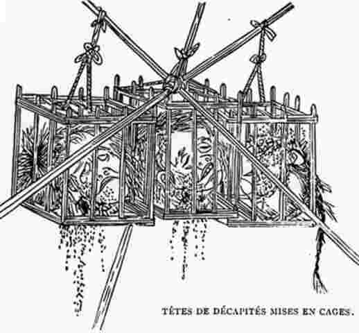 Information: Two kinds of pictures representing Exposure of the head, 梟示, which was an irregular punishment (runxing 閏刑), as it was not listed among the Five regular penalties (wuxing 五刑). A Criminal's head was left for up to two weeks in a wooden cage on a public place; the family was often allowed to redeem the to be buried with the corpse.