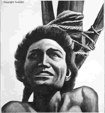 Pour ménager la sensibilité de nos lecteurs, nous ne reproduisons que le visage - étrangement extatique - d'un criminel auquel on est en train de faire subir l'épouvantable supplice des "Cent Morceaux". Déjà, on lui a désarticulé les jambes, coupé les bras, arraché les chairs de la poitrine, et il sourit, dans l'ivresse de l'opium. |