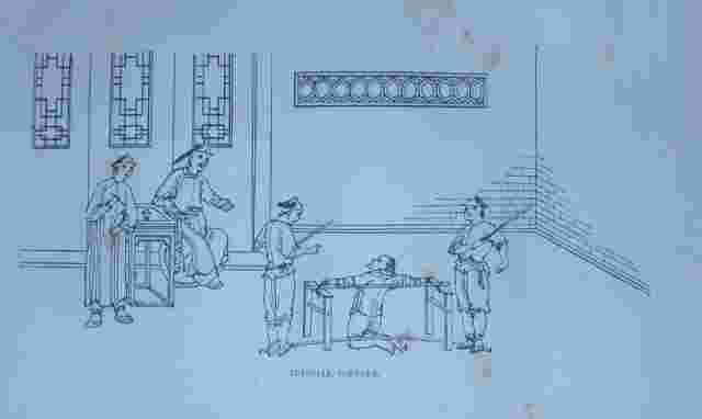 Description: The set is made of paintings representing judicial torture, cangue and exposition of a severed head.