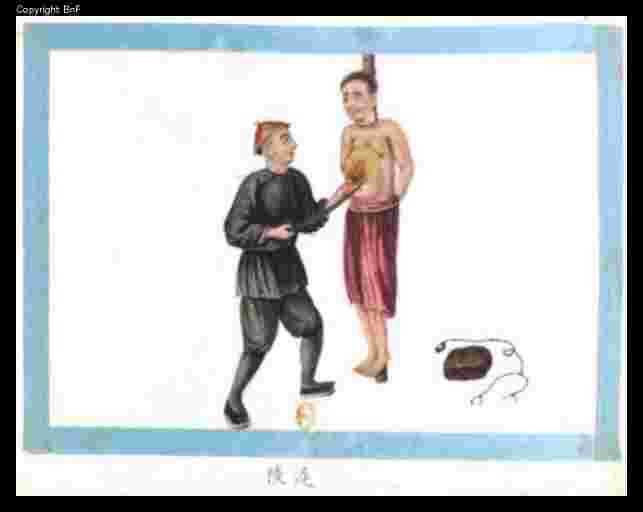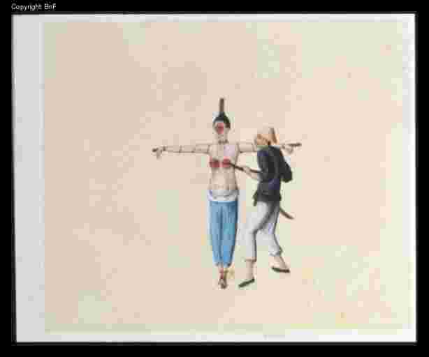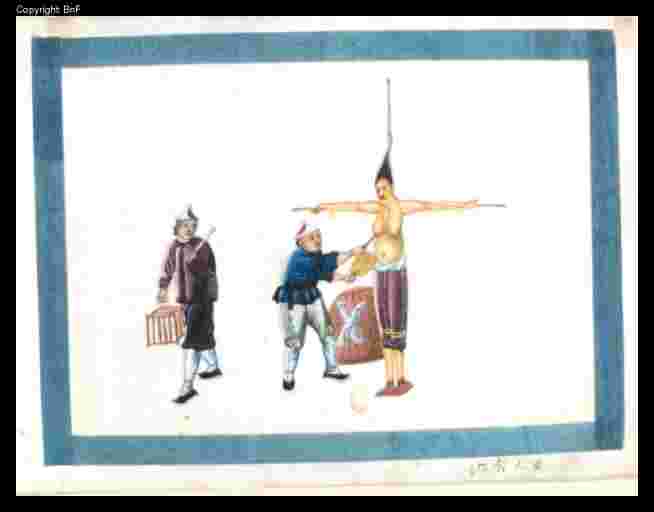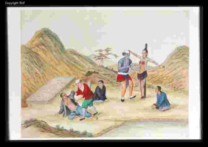 Description: Images extraites des albums d'aquarelles chinoises, titrés "Supplice chinois" et donnés à la Bibliothèque Royale dans les années 1830; actuellement conservés au cabinet des Estampes, Rue Richelieu. A comparer avec les jeux de NYPL et Peabody Museum.