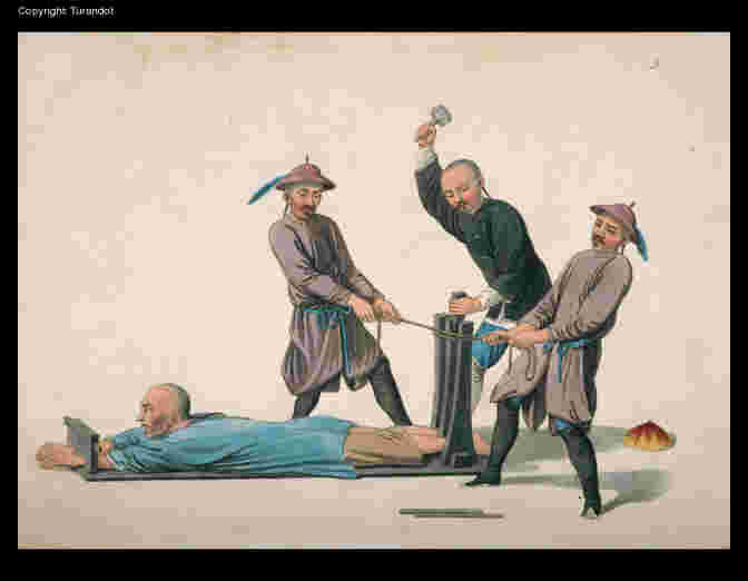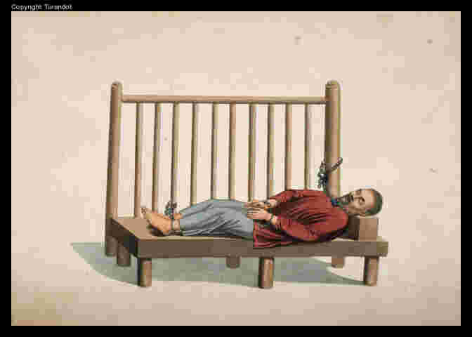 Cet homme est suspendu, par les épaules et les chevilles des pieds, dans une position très-doloureuse. Par intervalles, deux officiers, qui l'assistent, apportent quelque peu de soulagement à ses souffrances, en le soutenant avec un bambou passé sous sa poitrine. Un crayon, de l'encre, et du papier, sont prêts, pour tenir note de ce qu'il peut dire.