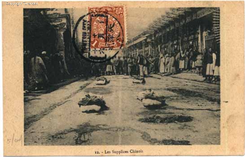Description: This serial of 12 postcards was probably made of one same set, taken at Caishikou on the 10th of April 1905, when the last lingchi execution was meted out. Fu-zhu-li's dismemberment (n° 2 to 6, and n° 9) was preceded by decapitations (n° 1, 7, 8, 12). N° 10 and 11 come from other sets (n° 11 dating back to the Boxer's executions, four years earlier)